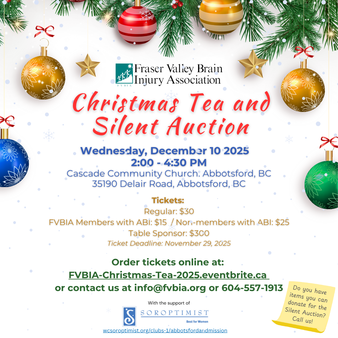 Join us for this English-style High Tea for dainty snacks, festivities and silent auction to help raise funds for services for people with acquired brain injuries in the Fraser Valley.