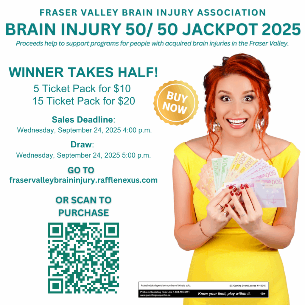 Fraser Valley Brain Injury Association’s 2025 online 50/50 Jackpot Draw Deadline is Wednesday September 24, 2025 at 4:00PM. Be sure to get your tickets!